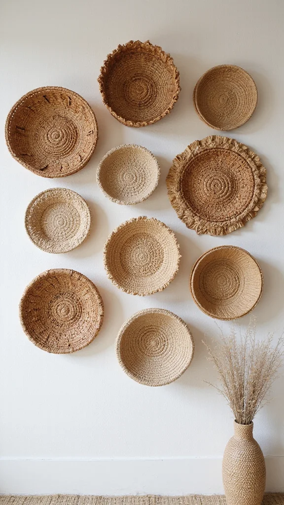 Woven baskets can be a stunning and practical decor choice for your walls! Hang a collection of baskets in varying sizes and textures for a delightful bohemian aesthetic. This approach adds warmth and depth while turning a plain wall into an eye-catching display. Mix materials like bamboo, rattan, and seagrass for added interest.