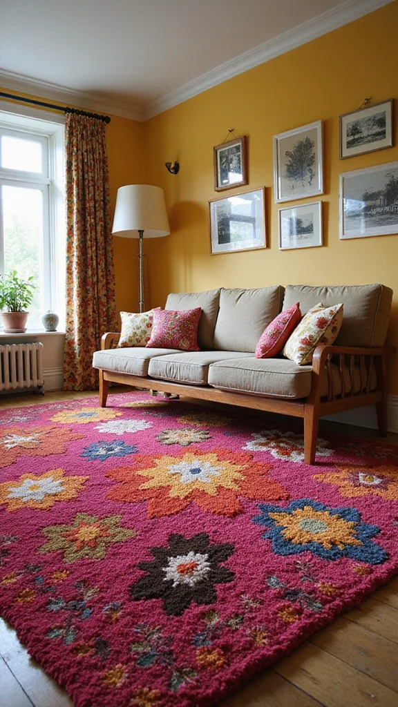 Rugs are key to grounding your living room and adding warmth. The 70s embraced bold patterns and textures, so consider shag rugs or those with vibrant geometric designs.