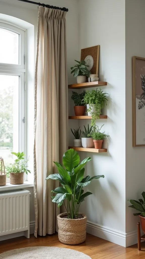 • Use corner shelves for plants or decor.