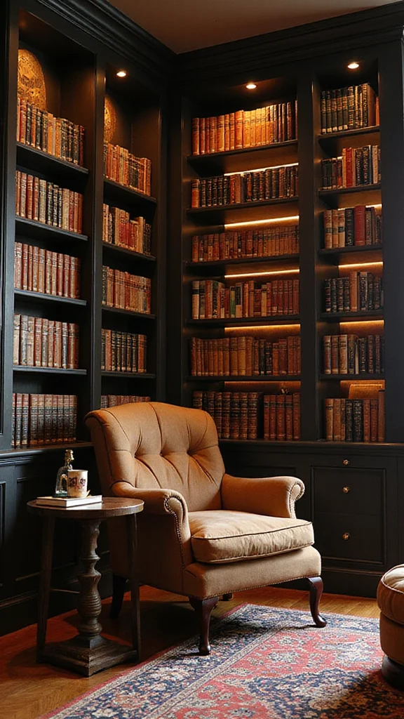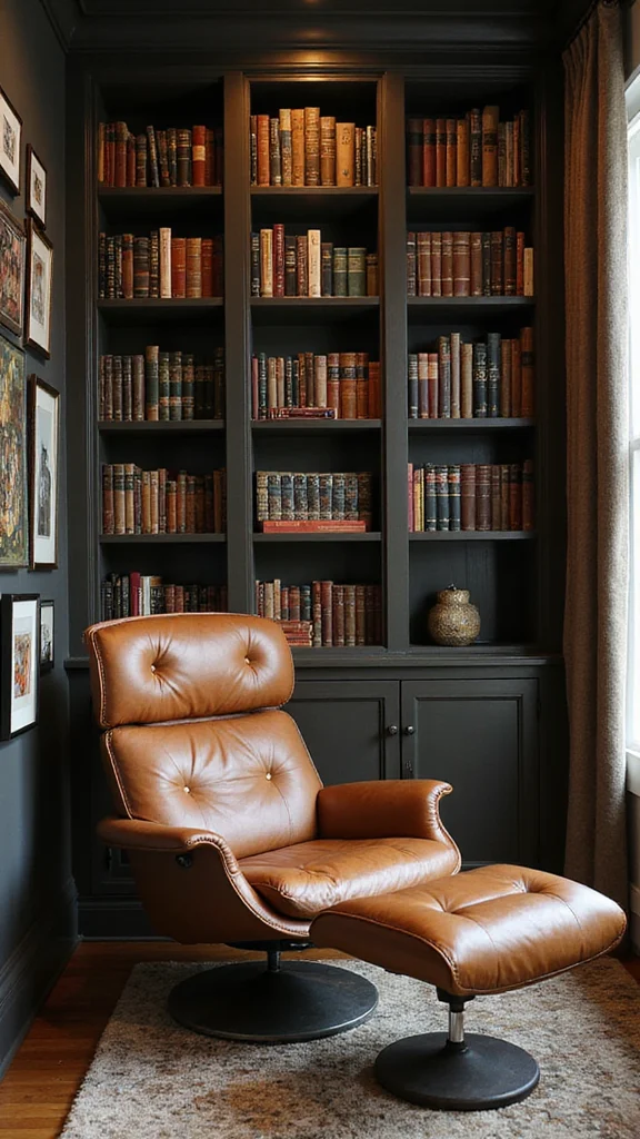 Create a personal library that emphasizes comfort and style. Use floor-to-ceiling shelves to display your favorite books. Arrange them in a visually pleasing way for an inviting atmosphere. A cozy reading chair and good lighting make this space even more inviting.