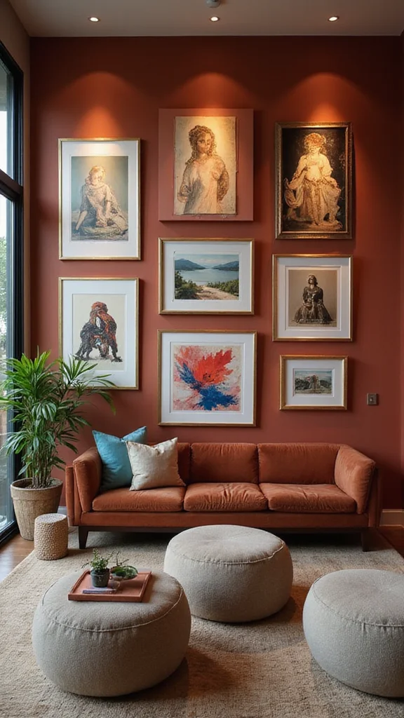 Layer different types of art like photos and dimensional pieces for added depth. Non-conventional pieces made of fabric or wood can also serve as striking focal points.