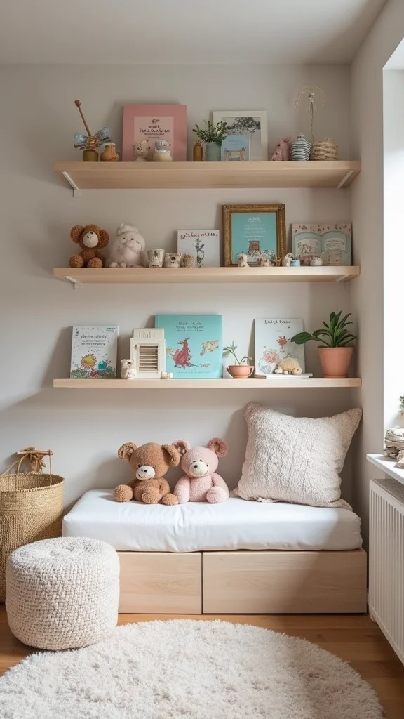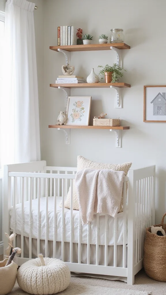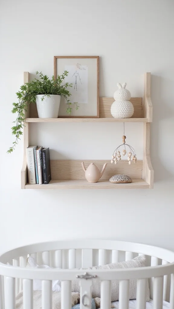 Another great idea is to use wall-mounted shelves to save floor space and display cute decor items or essential baby items, giving your nursery a tidy and stylish look.