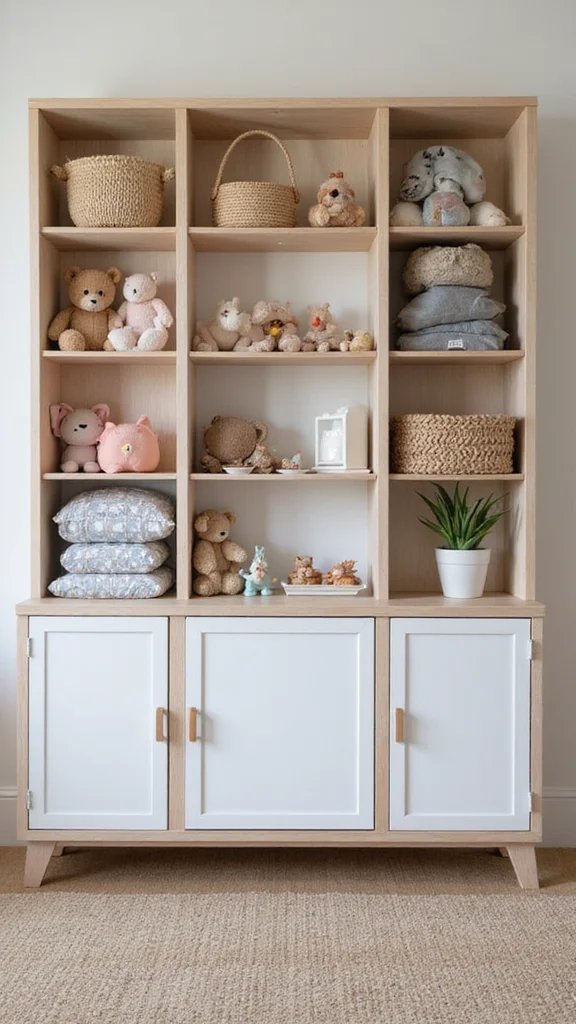 The KALLAX shelf is a go-to for parents, and it’s easy to see why! This adaptable piece holds a lot of books, toys, and clothes, making it essential. You can set it up horizontally or vertically, depending on your nursery’s design. Fill it with colorful bins or baskets to keep everything organized and visually appealing. Pinterest showcases this style, proving it’s a chic choice for any nursery.