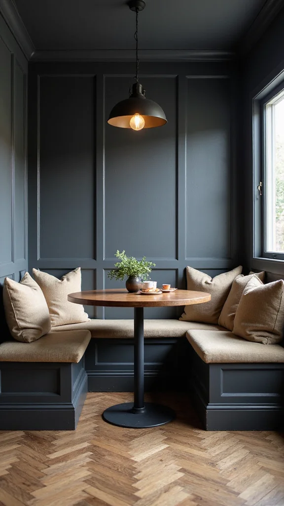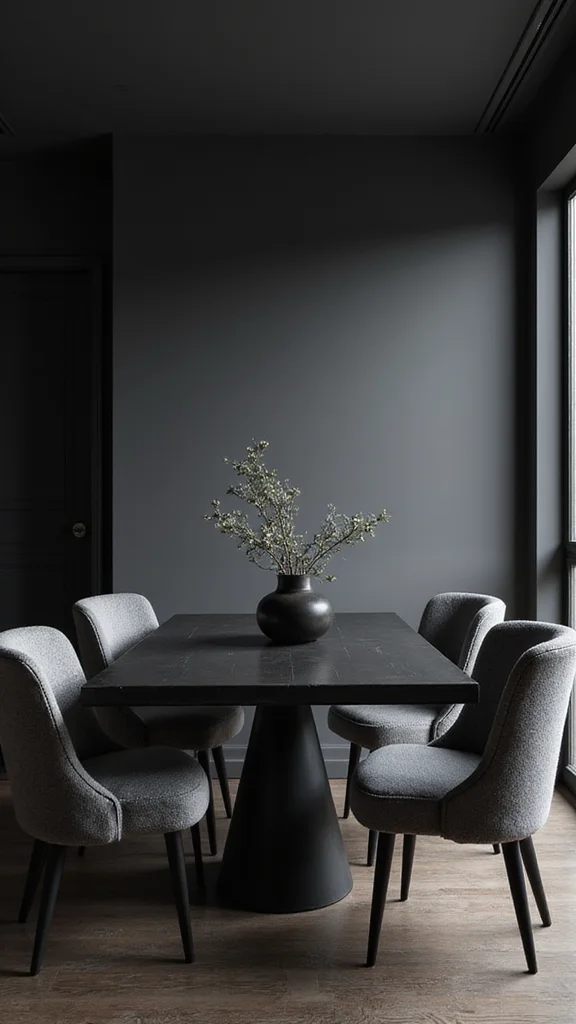 Deep charcoal grey walls add a touch of sophistication to your dining area. Imagine pairing them with a rustic wooden table, creating a striking contrast that feels modern yet inviting. Metallic accents like brass or gold in light fixtures can elevate the elegance of the space. Pinterest often showcases this combination, making it a popular trend among design enthusiasts.