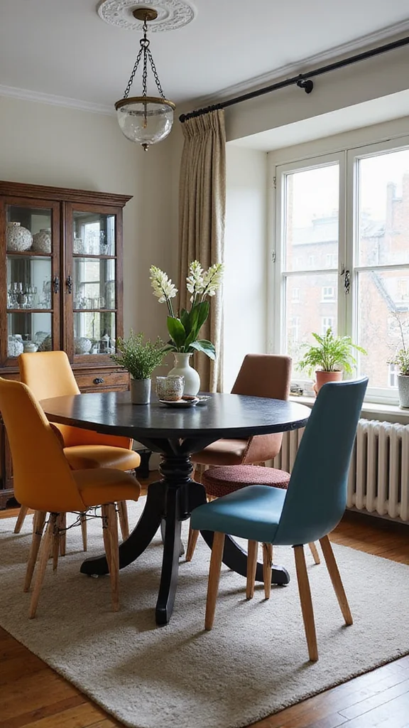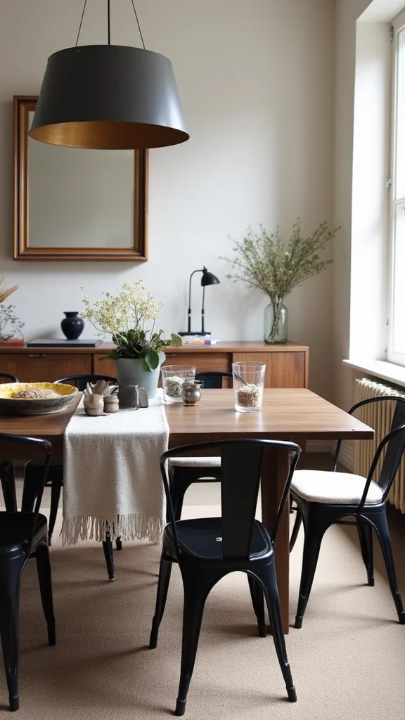 Mixing different furniture styles can create a unique and personalized dining space. Consider pairing a dark table with colorful vintage chairs or combining modern and rustic elements. This eclectic approach makes the room feel lived-in and comfortable, reflecting your personal style.