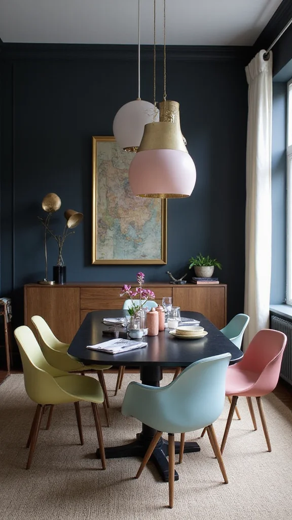 Using dark colors in the dining room doesn’t mean sacrificing fun! Consider adding pops of color through table settings or decor. Bright napkins, colorful plates, or bold artwork can create exciting focal points in your dark space. This playful approach balances liveliness and elegance, making the room feel inviting.