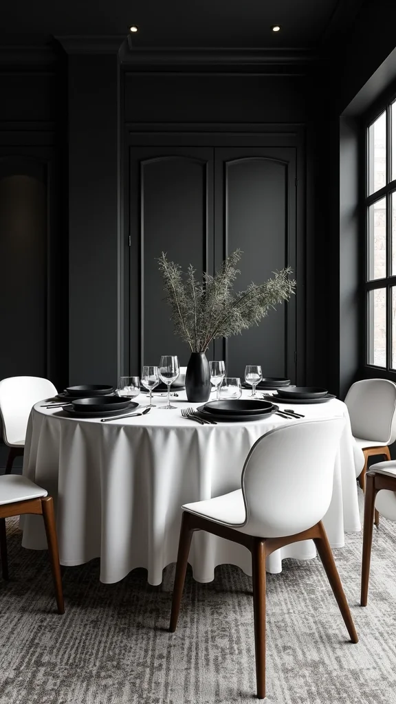 Use black dinnerware on a white tablecloth for a sophisticated dining experience. Layer with a patterned rug to add texture and interest. This scheme is flexible and adapts well to seasonal decor changes, making it a versatile choice.