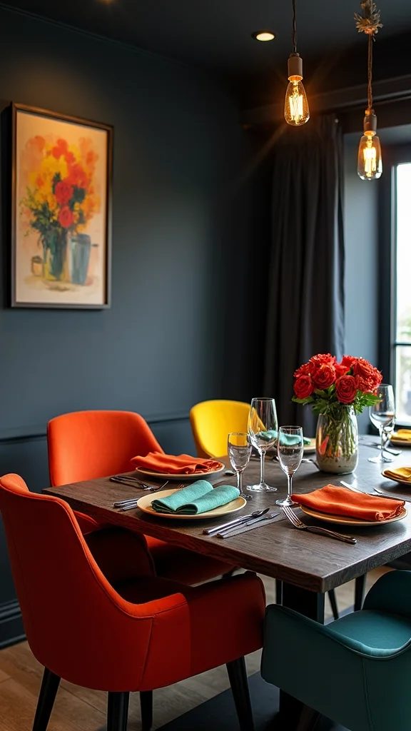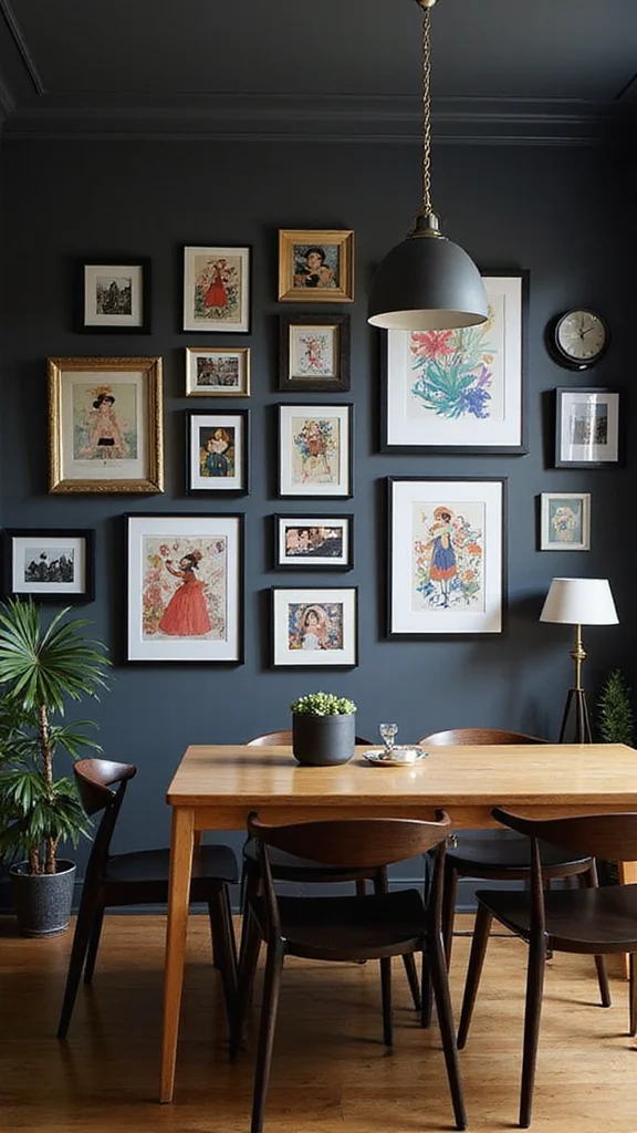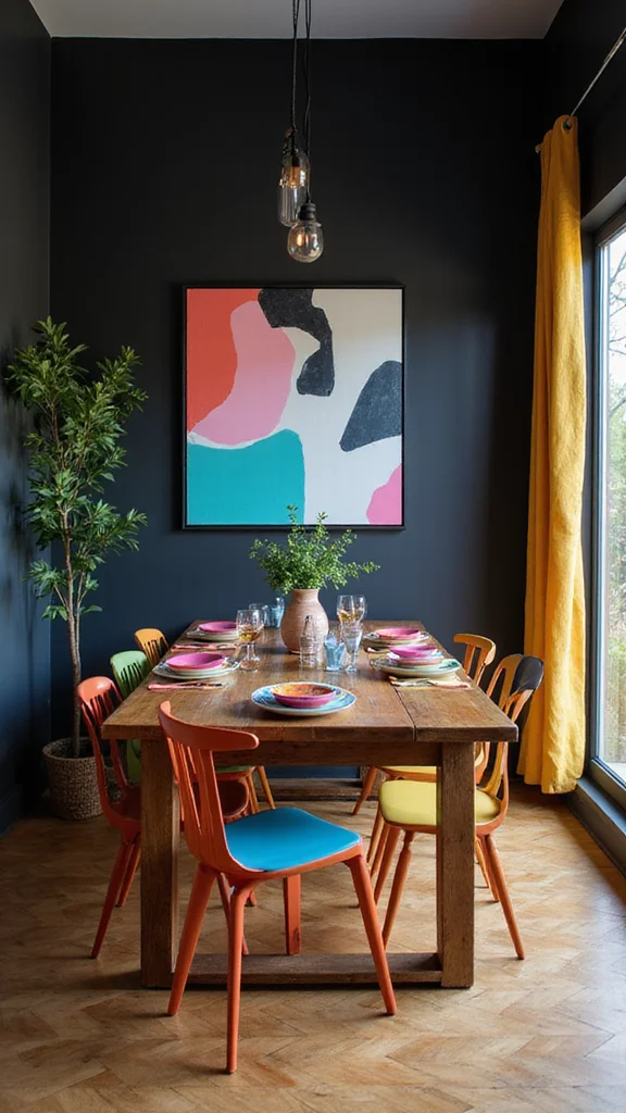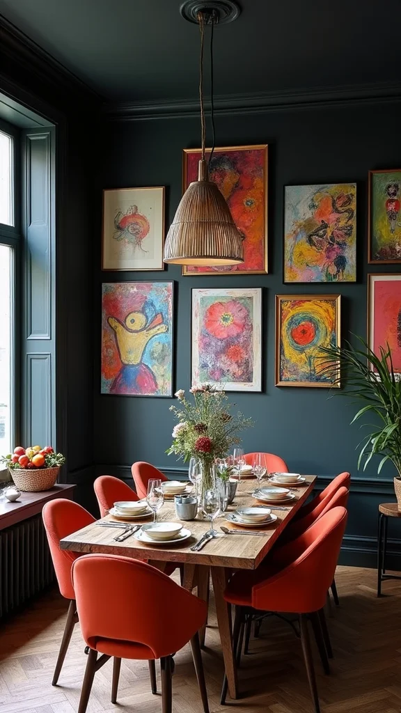 Dark walls create an ideal backdrop for vibrant artwork. Bold pieces can turn your dining room into a mini-gallery, highlighting art as the focal point. Hang large canvases or framed prints that pop against the dark palette. A rustic table complements the artistic vibe, while colorful accessories add life to the setting.