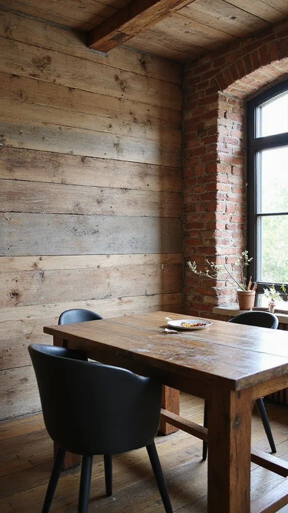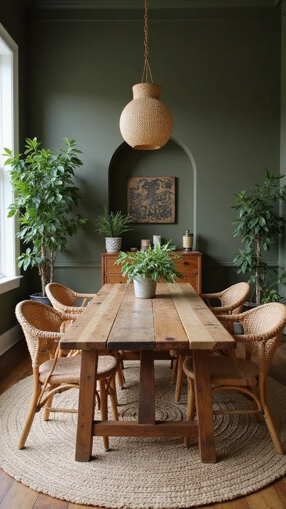 Bring an outdoor feel inside with earthy tones and textures. Deep olive or rust colors can create a warm, inviting atmosphere. A reclaimed wood table pairs beautifully with these hues, enhancing the rustic charm. This design style is often celebrated for its connection to nature, making it a favorite in eco-friendly interiors.