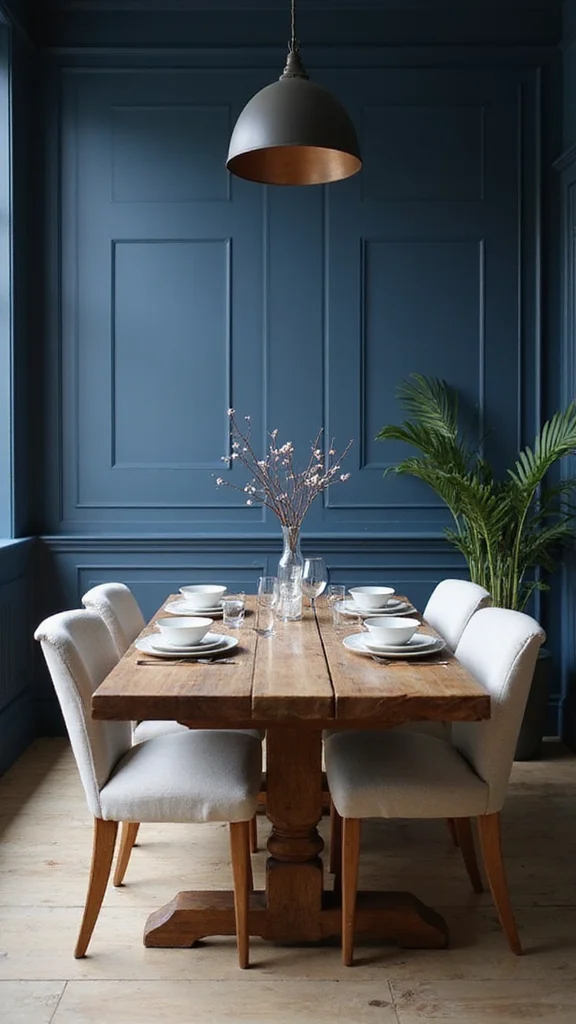 Midnight blue walls can transform your dining room into a serene escape. This rich hue pairs wonderfully with natural wood elements, like a reclaimed wood table, creating a cozy atmosphere. Bright dinnerware and colorful centerpieces pop against the deep background, making every meal feel special. Many design blogs feature this calming color, highlighting its versatility.