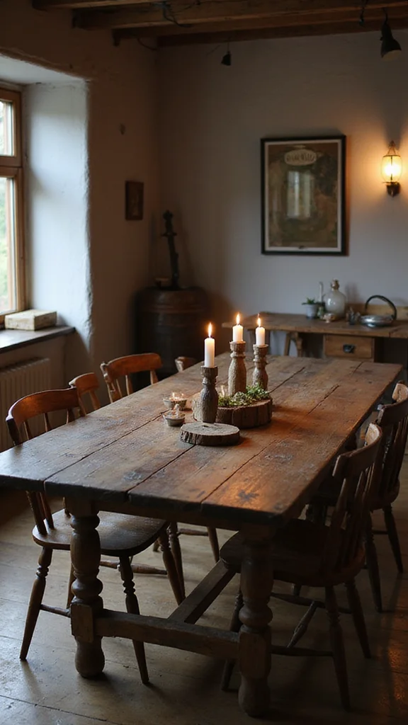 A dark wooden table can become the centerpiece of your rustic dining room. Opt for a sturdy farmhouse-style table that invites family and friends to gather around. Mismatched chairs or benches can add a relaxed and eclectic vibe to the space. This charming style often appears in cozy home magazines, showcasing its inviting nature.