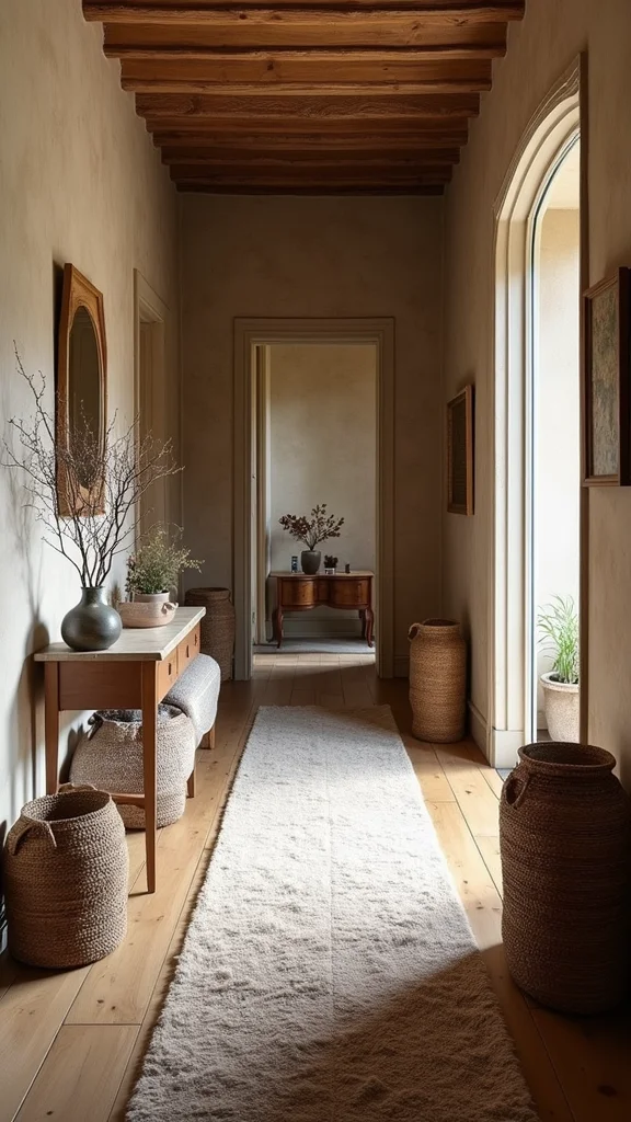 Texture is vital for creating an inviting hallway. Layer materials like plush rugs, velvet cushions, and woven baskets to add warmth and comfort. Mixing textures like wood, metal, and fabric creates visual interest that draws people in.