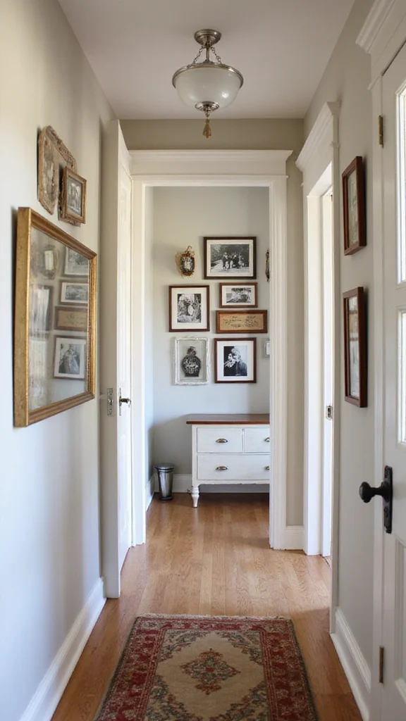 A gallery wall is a fun way to showcase art and memories while adding character to your hallway. Mix framed pieces, from photos to art prints, for an eclectic yet cohesive look. Varying frame styles and colors can add a playful vibe.