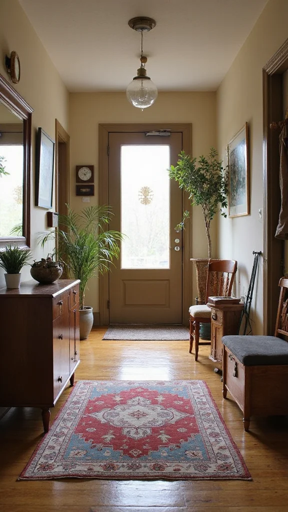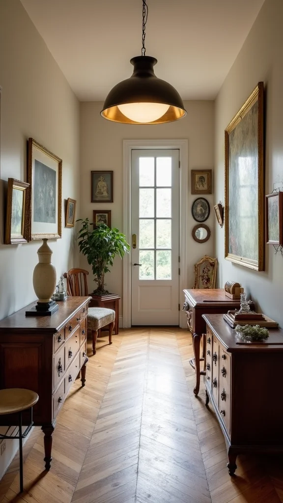 Shop at thrift stores or flea markets for affordable treasures. Mixing textures, such as a soft woven rug with a rustic wooden table, can create a layered look. Displaying family heirlooms adds a personal touch, connecting your hallway to your life experiences.