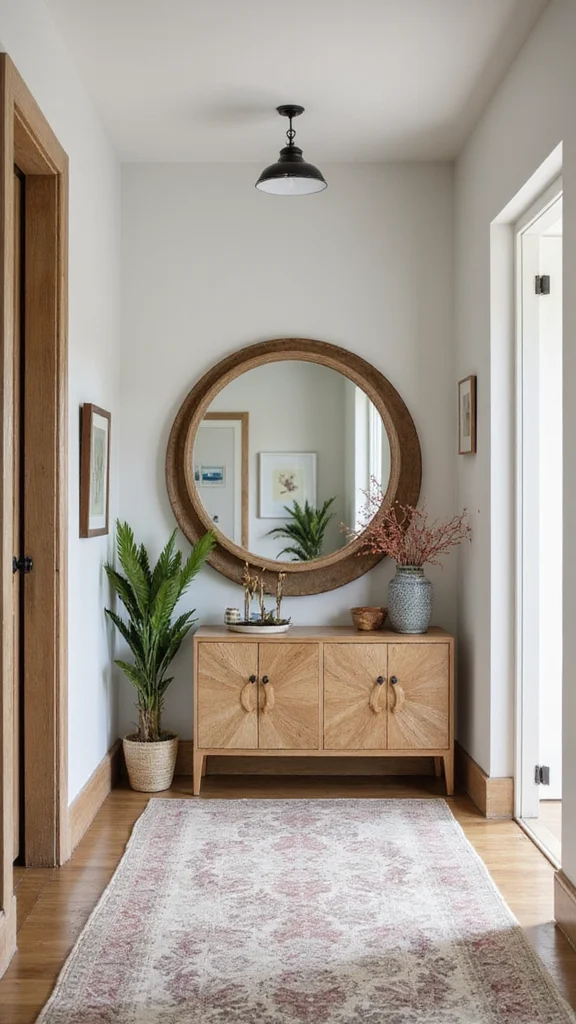 Your hallway should warmly welcome guests. Start with a statement piece, like a beautiful console table or eye-catching rug. Fresh flowers or a small plant can add life, while a chic mirror enhances brightness.