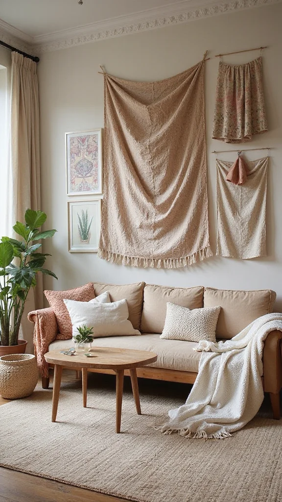 Drape fabric panels or tapestries behind your couch to add warmth and texture. This creates a soft, inviting backdrop that feels cozy. Choose fabrics that match your color scheme, and don’t hesitate to mix patterns for a fun, eclectic vibe.