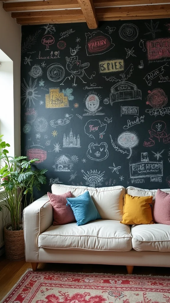 Want to make your decor playful? Paint the wall behind your couch with chalkboard or whiteboard paint. This fun idea lets you draw, write notes, or showcase seasonal art, keeping your space dynamic and engaging.