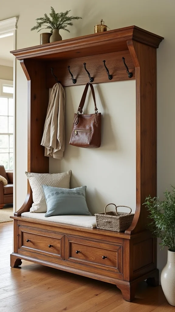 Elegant wooden coat racks serve a practical purpose while enhancing decor. You can design them with intricate details, making them stand out in any entryway. Using reclaimed wood gives a rustic touch that appeals to those valuing sustainability.