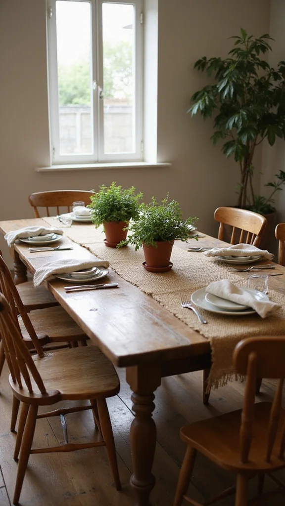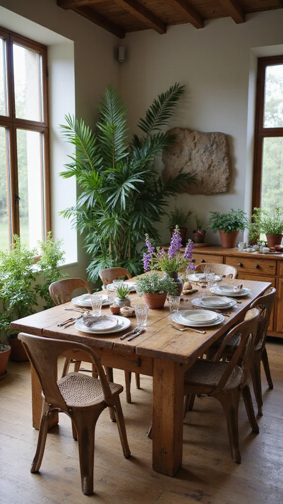 This combination celebrates the raw beauty of nature while providing a cozy setting for family meals and gatherings. Add some potted herbs as table centerpieces for an aromatic touch and to bring the outside in!