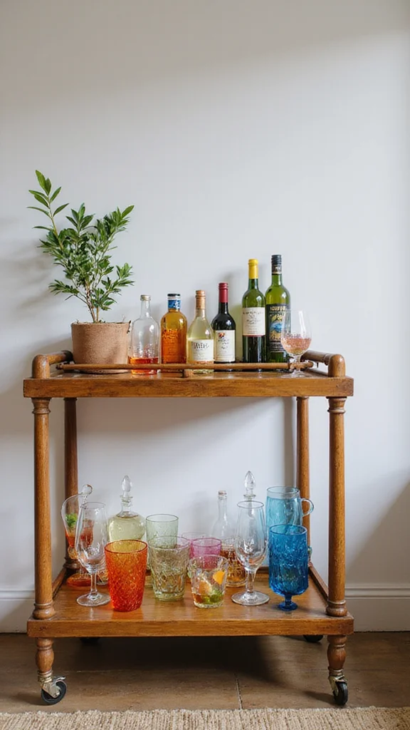 Use a vintage cart and fill it with your favorite wines, colorful glassware, and unique mixers. This not only serves as a functional piece but also acts as a decorative element.