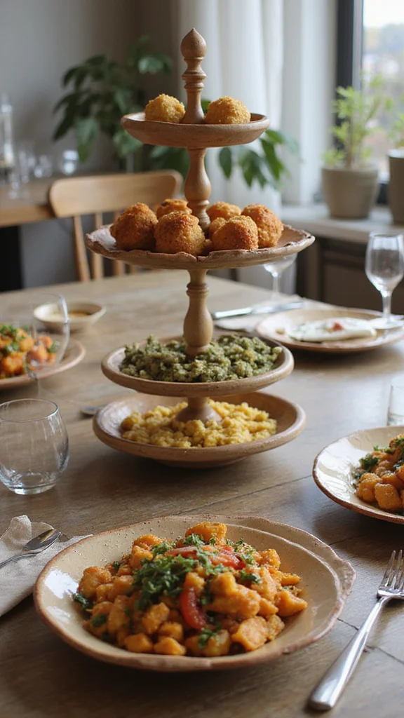 Consider tiered serving trays, elevated platters, or stacked bowls to serve food as well as add visual interest. This dynamic approach encourages sharing and engaging with the meal while also enhancing the table’s decor.