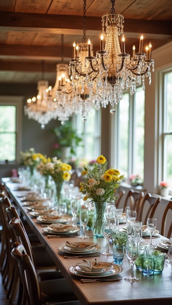 Use glass vases, crystal chandeliers, or even colored glassware that catches the light beautifully. These elements can create a sense of airiness while adding a glamorous touch to the rustic Mediterranean style.
