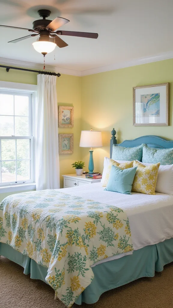 Summer Serenity creates a light, breezy guest room. Bright yellows and ocean blues set a cheerful mood. Lightweight cotton bedding and striped or airy textiles keep things cool. A touch of nautical decor adds seasonal charm.