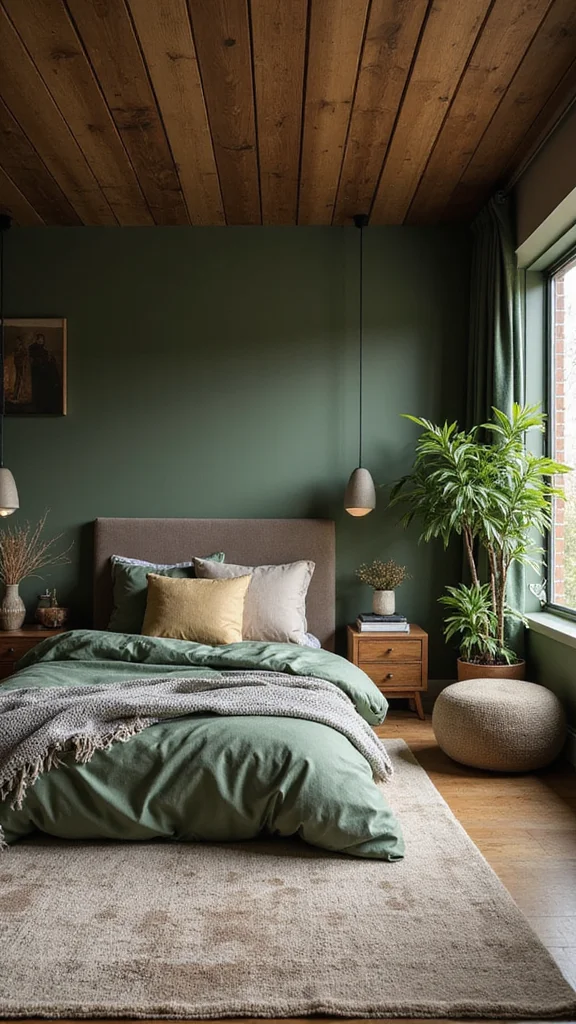 Earthy Retreat grounds the room with nature. Deep greens, terracotta, and wood tones create a calm, earthy canvas. Layer woven blankets and textured rugs to add warmth and depth. Plants bring freshness, while handmade pots give a crafted touch.