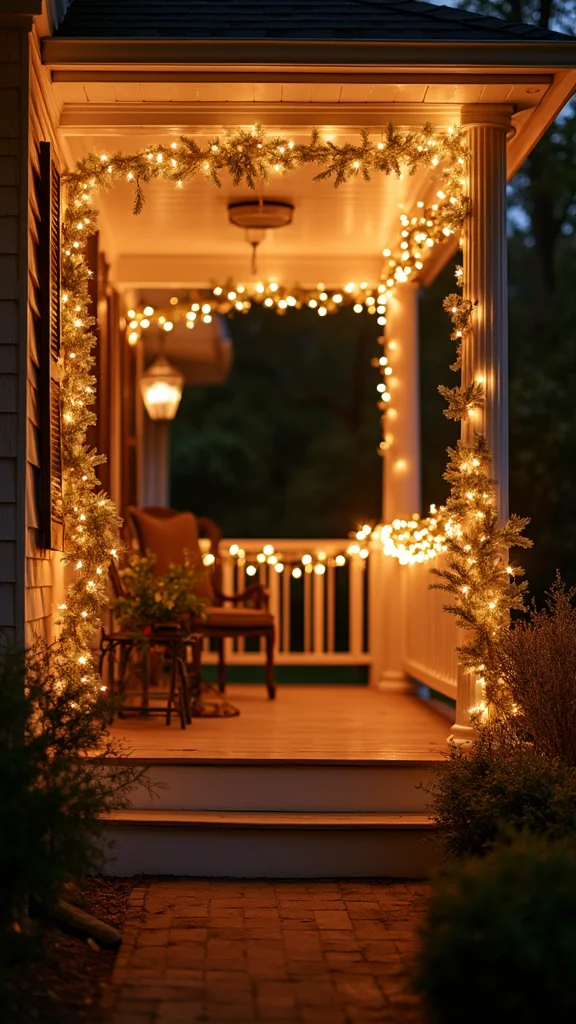 For a cozy vibe, wrap your porch railing with soft white lights or hang icicle lights for a festive touch. Don’t forget to add some fun elements like illuminated lawn figures or a lighted wreath on your door to complete the look!