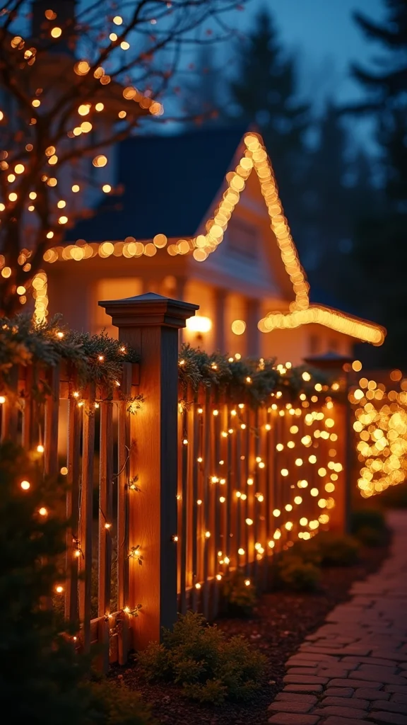 String lights set the mood with a warm, welcoming glow that defines your home’s holiday look. They soften the exterior and invite guests to linger. Picture warm-white strands along the porch rail, or colorful bulbs woven through tree branches. Pinterest loves this cozy approach, and design blogs show it turning simple spaces into festive scenes.