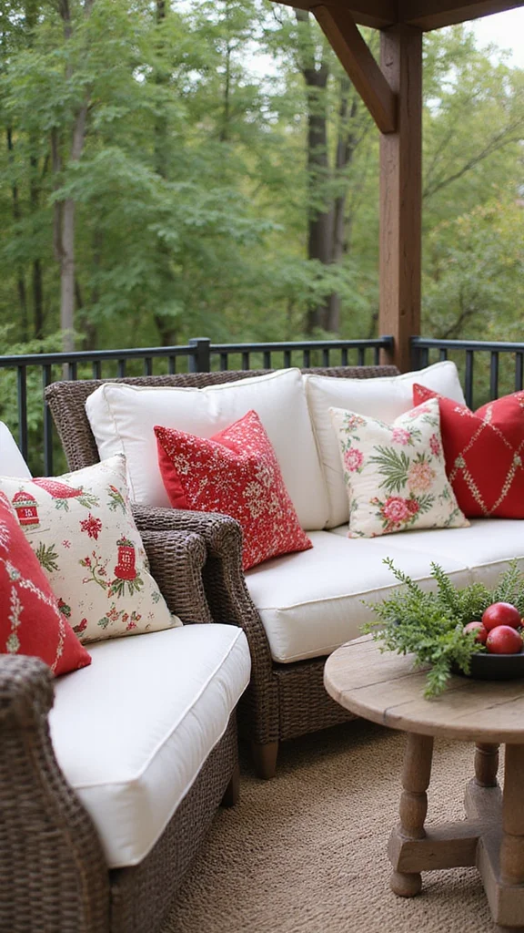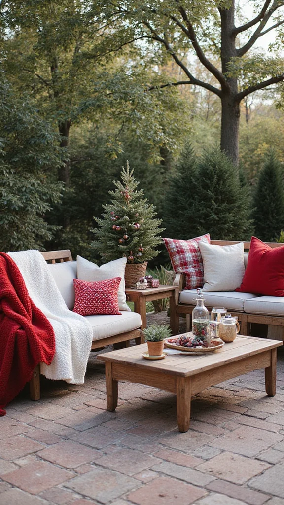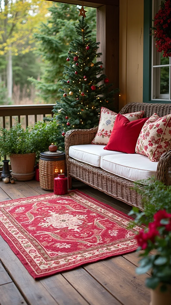 Outdoor rugs add comfort and anchor your space. Pick patterns that fit holiday colors or festive motifs. Rugs help define dining and seating zones with warmth.