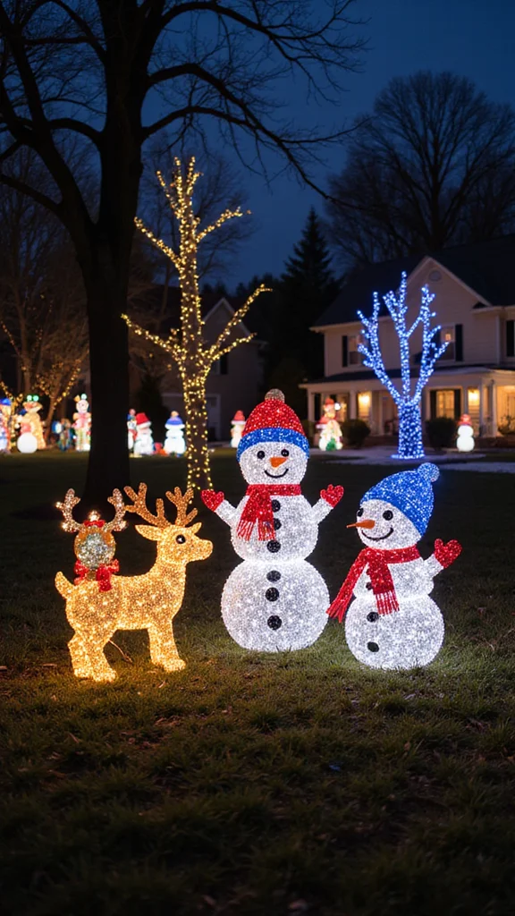 Garden sculptures add character and holiday spirit. Choose figures like Santa, snowmen, or woodland creatures to bring charm to your yard. When lit, sculptures glow with a playful elegance.