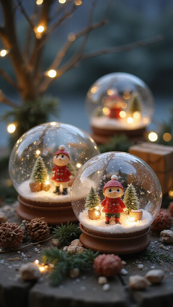 DIY snow globes add whimsy to outdoor spaces. Build jars with mini figures, faux snow, and twinkling lights for a personal touch. You can place them on tables or hang from branches.