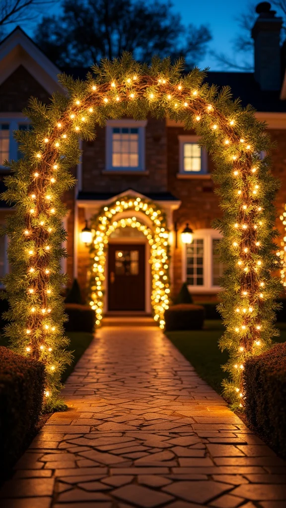 An illuminated arch marks a grand entry. Drape lights or greenery over a sturdy frame for a striking welcome. It defines space and adds beauty to your front path.
