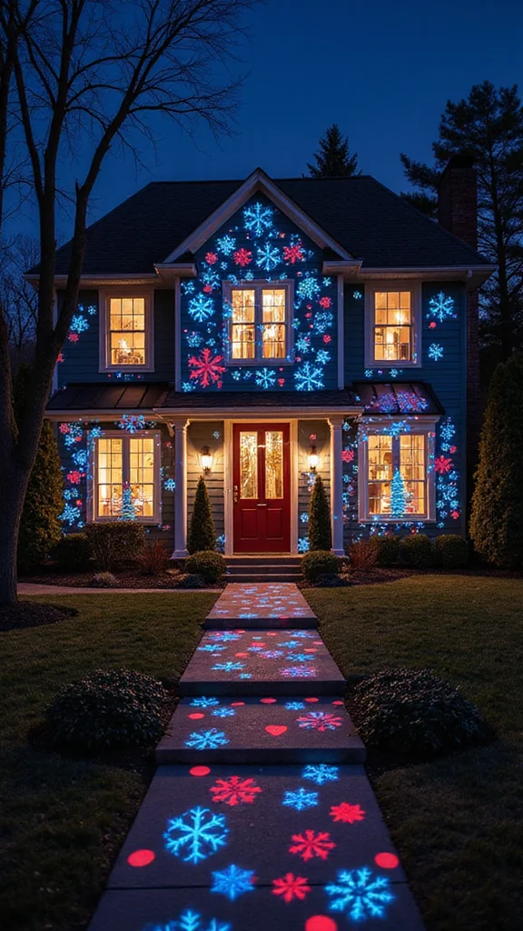 Set them to a timer to save energy and place where they have a clear wall to project. Align the design with your overall theme, whether classic snow or bright summer florals. Switch designs with the season for fresh drama. Projections add a modern touch that wows guests and neighbors.