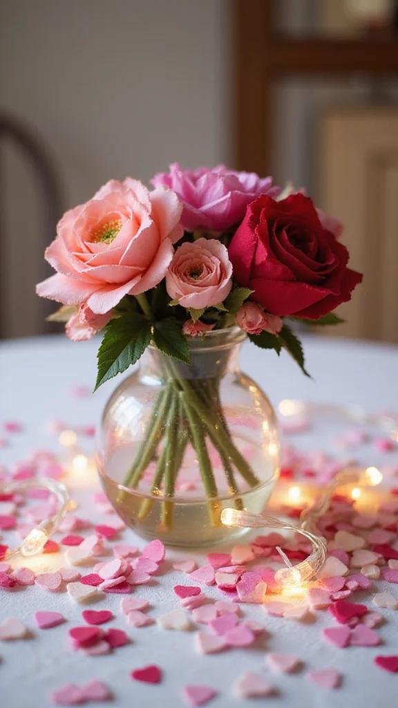 This centerpiece anchors the table with warmth and romance. A glass vase filled with faux roses or tulips from dollar stores creates a lush, affordable focal point. Add heart-shaped confetti around the base for whimsy, and tuck a string of fairy lights inside for a soft glow. This simple arrangement sets the tone for a night of love.