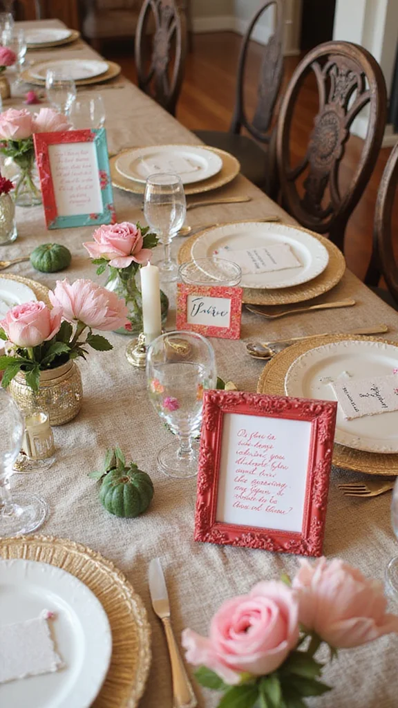 Love quotes add depth to your table. Find decorative frames at the dollar store and print sweet messages. Place frames around the centerpiece or use them as mini focal points. They invite conversation and warmth.