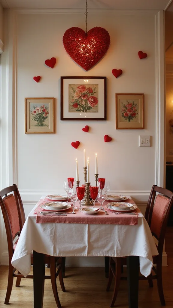 Wall art extends the Valentine mood beyond the table. Look for heart shapes or love prints at dollar stores. Frame them or hang hearts with twine for a cohesive look. The art wraps the space in romance.