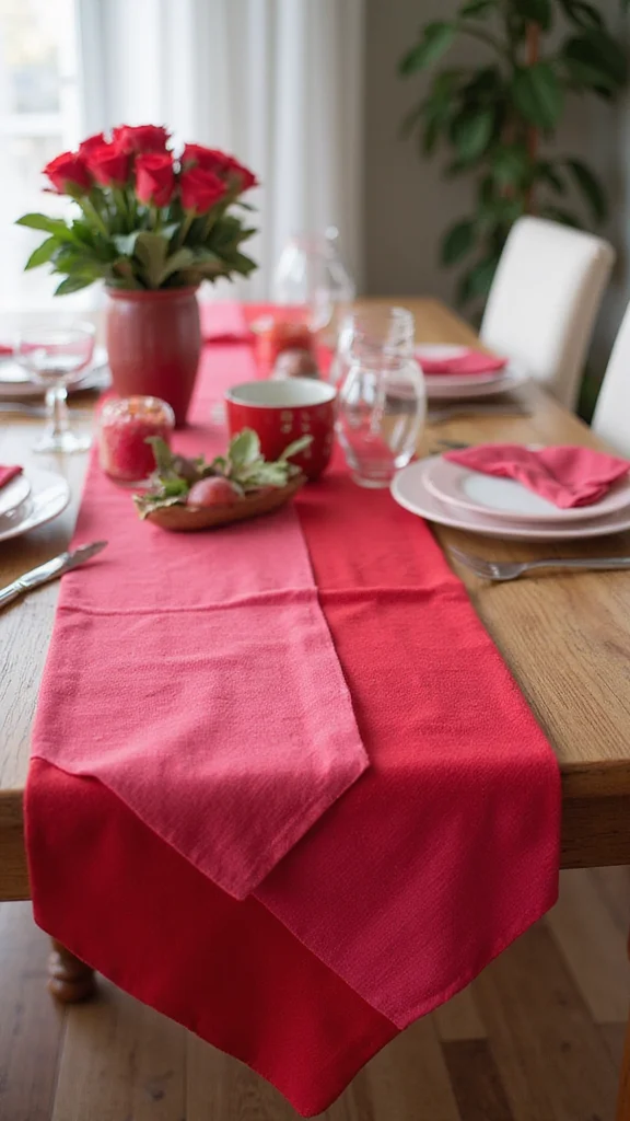 Colorful runners anchor the table with bold energy. A red burlap runner gives a rustic feel, while a satin pink adds elegance. You can DIY by cutting fabric from the dollar store to fit your table. Layer two colors for a striking effect.
