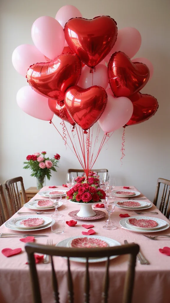 Heart balloons bring instant whimsy to the table. Mix helium and air balloons to create height and movement. Tie them around chairs or place as clusters to form playful focal points. Their light, cheerful presence suits Valentine’s vibes.