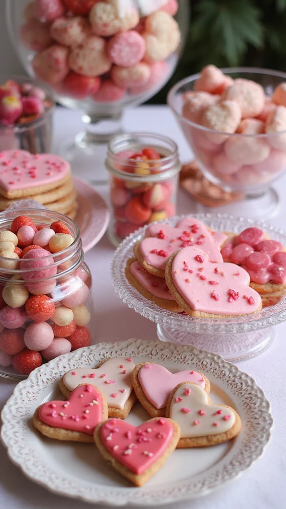 A sweets spread invites smiles. Use clear jars and decorative trays from the dollar store to show treats. Fill jars with heart candies, chocolate berries, or cookies. The colors and textures add a festive layer to the table.