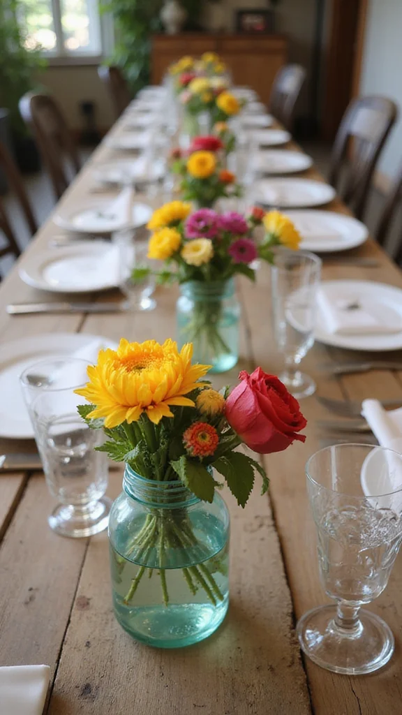 Mix wildflowers with roses for contrast. Add greenery to add depth and texture. Paint a few jars in metallic tones for a refined look. These floral touches keep the mood fresh and inviting.