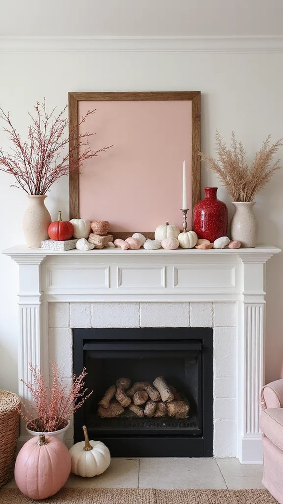 Choose a limited palette (red, blush, ivory) and repeat key elements across the mantle to create a cohesive look.