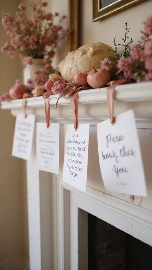 Love notes add a warm, personal touch to the display. Write short messages on sturdy cards and hang them on a ribbon garland across the mantle. You can frame some notes or tuck them into a small heart wreath for variety. This touch creates a sentimental moment that invites smiles and memories.