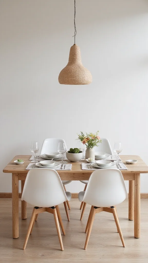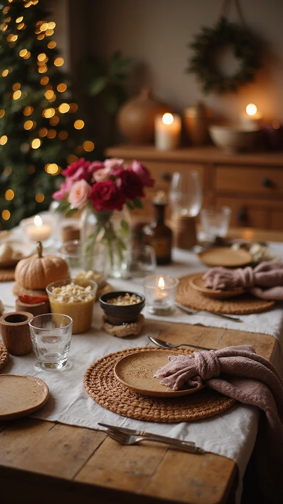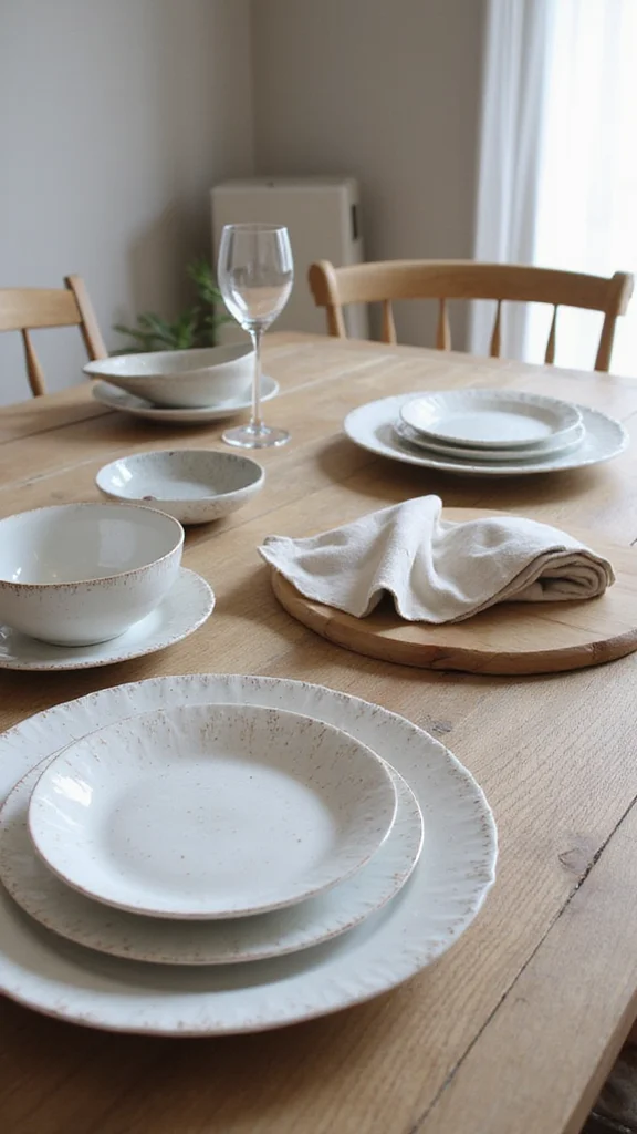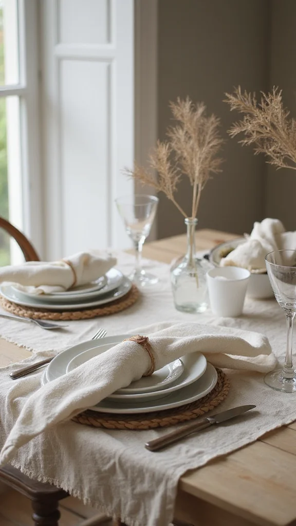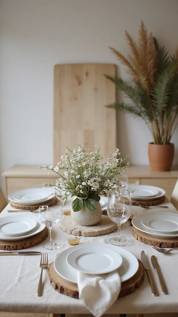 Incorporate natural textures like a linen runner, wood placemats, and a tiny cluster of greenery to add warmth without clutter.