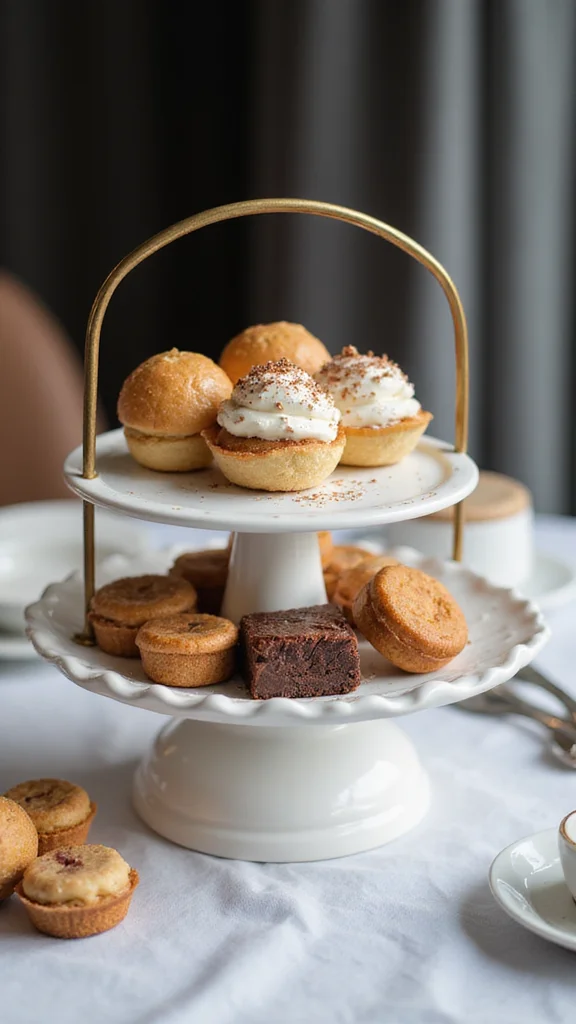 A simple tiered stand adds height with grace. Choose a compact stand so it doesn’t overpower the table. Display a mix of desserts that bring color and texture. Add fresh fruit or small blooms around the stand for depth.