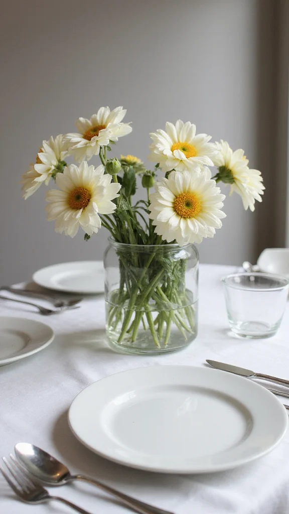 Fresh flowers bring life and romance to the table. A minimalist route uses a single flower type in a clean glass vase to let each bloom breathe. Pale roses or white peonies offer softness, while a low, table-spanning arrangement creates drama. Flowers pair well with greenery like eucalyptus for a fresh touch.