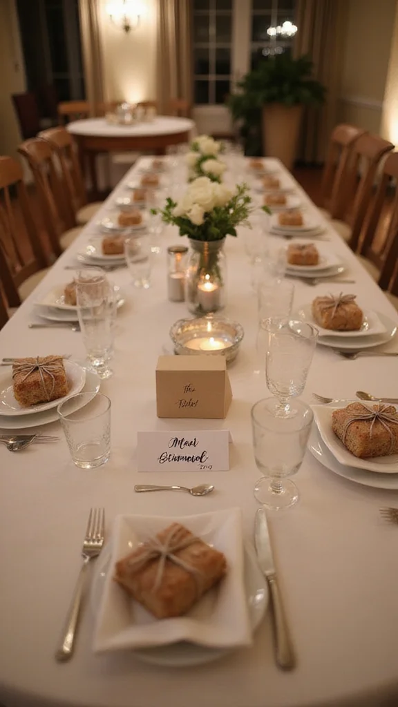 Personal touches give the night a true sense of you. Handwritten place cards guide seating and add intimacy. Choose pastel cards with a clean, modern script for a gentle look. Small gifts at each seat, like a tiny succulent or chocolate, leave a sweet memory.