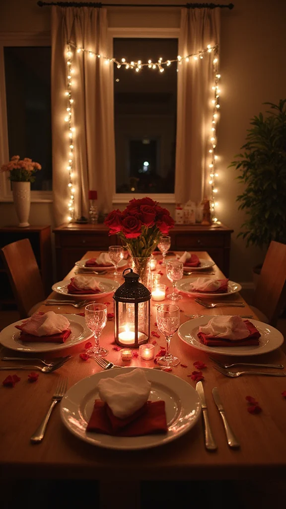 Lighting shapes mood on a Valentine’s table. String lights weave through greenery for magic. Candles and lanterns provide warmth. Smart bulbs can shift color to match moments.