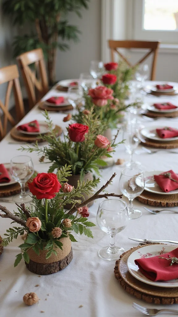 Nature makes the table feel fresh. Twigs, pinecones, moss offer texture. Wood log centerpieces with blooms feel organic. Eco-friendly materials keep the vibe kind to the land.